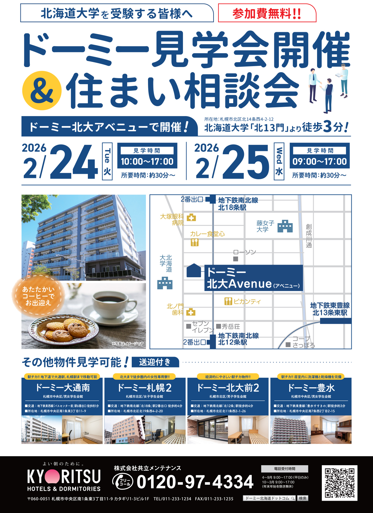 当日は、これら人気物件の空室状況に合わせ、万が一に備えた他の学生会館「ドーミー」も無料送迎付きでご案内いたします。 「合格が決まってから」では間に合わないこともある札幌の住まい探し。この見学会で、一足先に納得のいく住まいを見つけませんか?