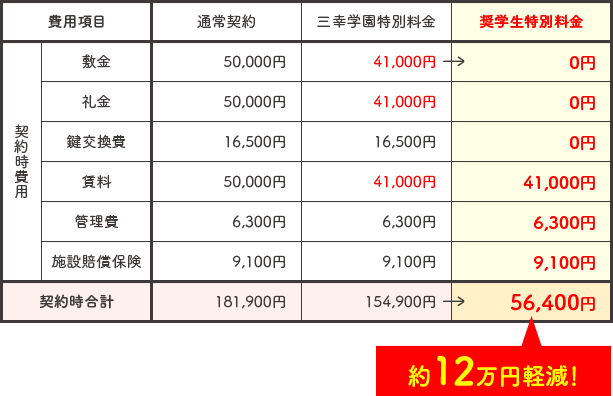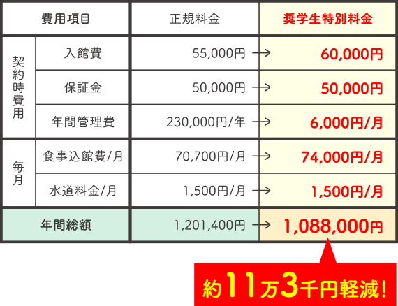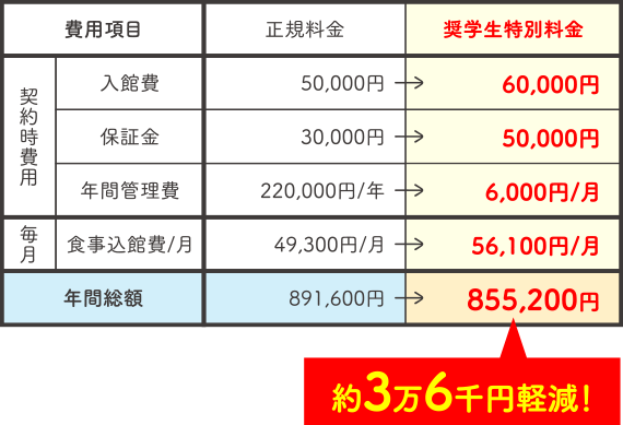 ※寮奨学生制度は単年の契約となり、契約更新時は更新料60,000円・事務手数料9,350円/1年が必要になります。